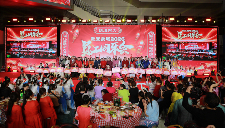 2月28日农历正月十二,欧亚卖场印度洋厅华灯璀璨,笑语欢腾。在员工热切期盼中,2026年员工同乐会如约盛大举办。欧亚卖场董事长、总经理于志良携众高管与现场千余名员工齐聚一堂,欣赏精彩表演,分享收获喜悦,凝聚奋进力量。